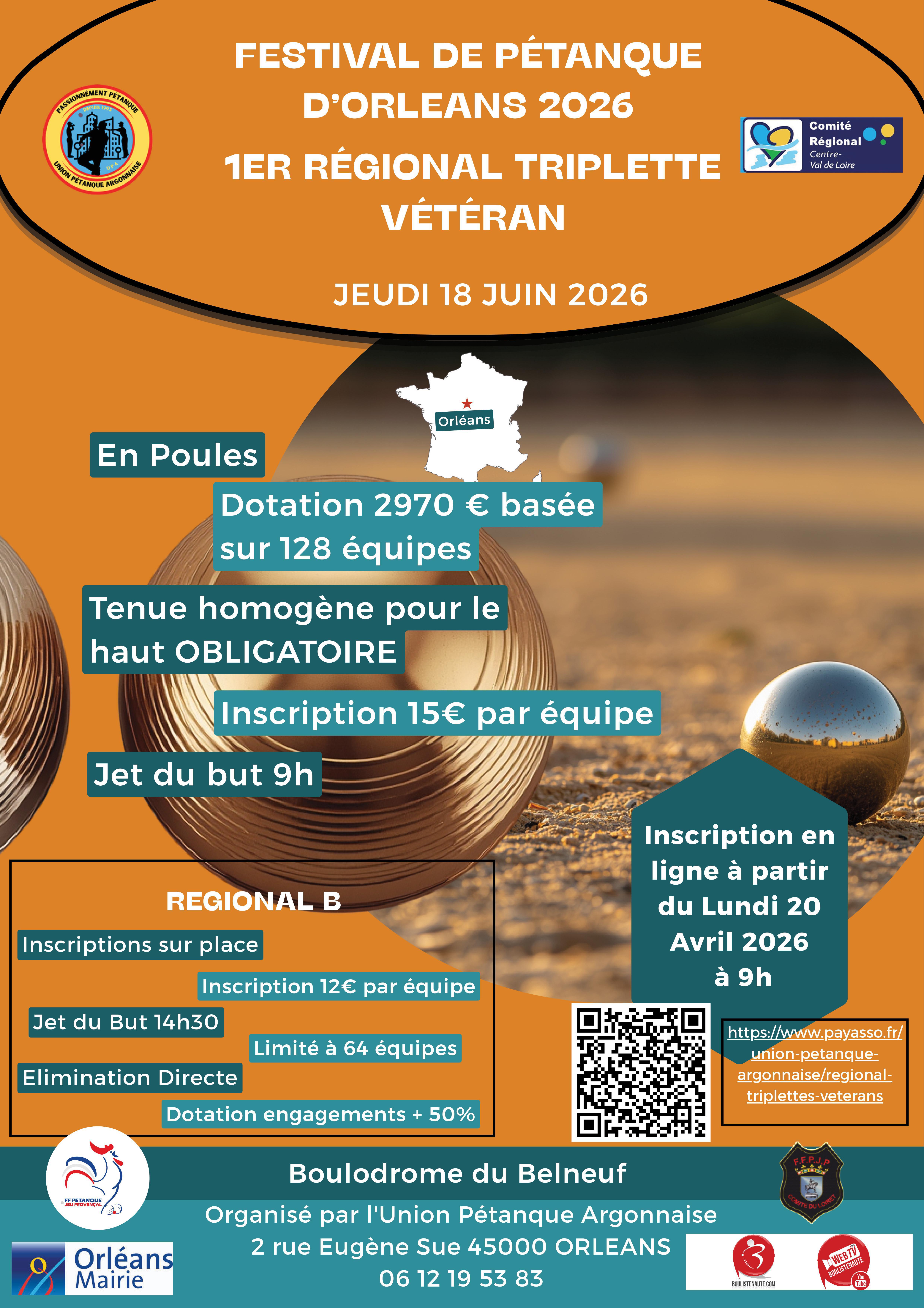 - En ligne : https://www.payasso.fr/union-petanque-argonnaise/national-triplette-seniors-orleans-2026 (à partir du 6 avril 9h00)