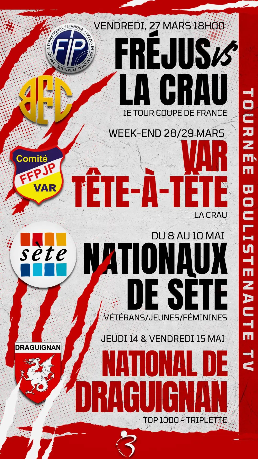 Coupe de France : Fréjus vs La Crau, le choc avec un suivi inédit en temps réel Le rendez-vous est fixé. Vendredi 27 mars à partir de 18h00, La Crau entre immédiatement dans le vif du sujet avec une affiche qui ne laisse personne indifférent. Dans le cadre du premier tour de la Coupe de France des Clubs, Fréjus affronte La Crau dans une confrontation directe entre deux formations construites pour jouer les premiers rôles. Pas de mise en route progressive, pas de calcul : l'élimination est au bout, et l'intensité sera présente dès les premières boules.