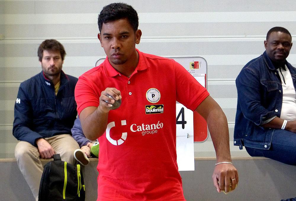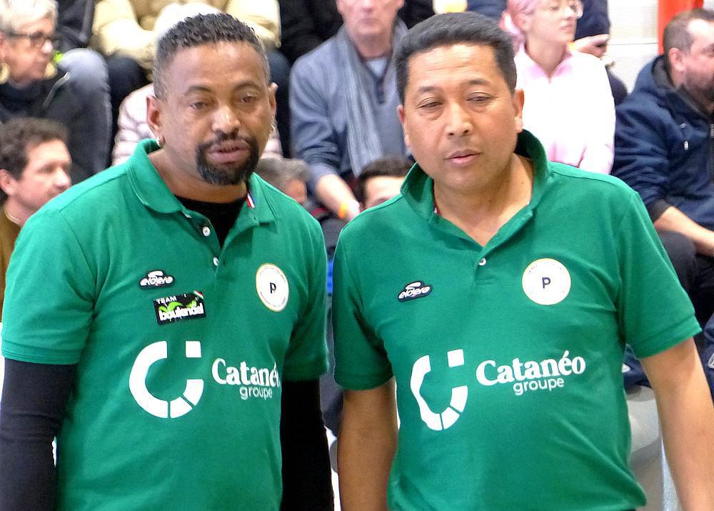 On s’en doutait : nous avions quitté Mason Durk à Cagnes en octobre, après un Europétanque des Alpes-Maritimes qu’il avait survolé en compagnie de Rocher et Robineau, et nous l’avons retrouvé à Genève en compagnie de l’un de ses tireurs préférés, Kevin Prudhomme. Intact et toujours aussi flamboyant. Il paraissait clair, au vu du jeu incisif et spectaculaire que déployaient les deux joueurs dès samedi, qu’il faudrait compter avec leur doublette dans le Geneva Indoor.