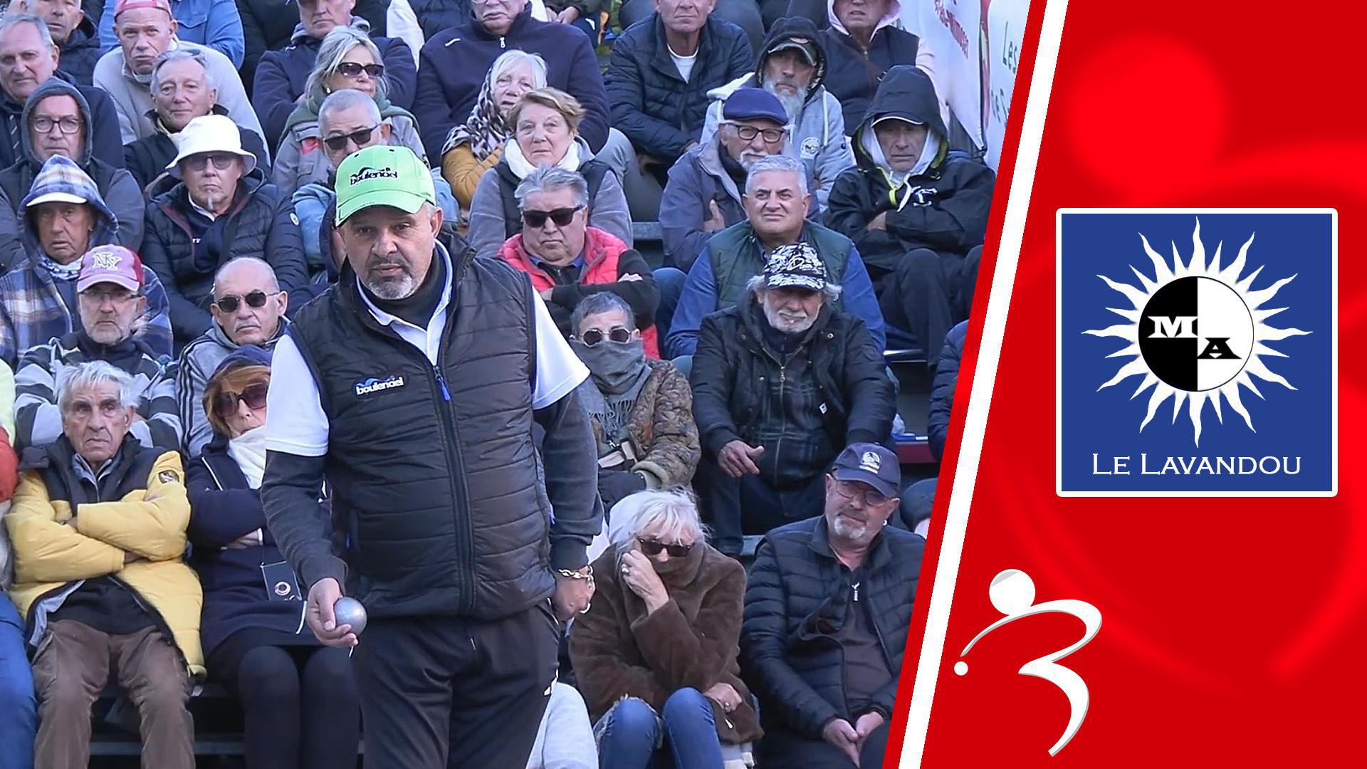Henri LACROIX (Var - Boule Fleurie Crauroise), Pascal ALBERTINI (Var - LEI Renaires Le Lavandou) et Simon CORTES (Pyrénées Orentales - Pétanque Canouharde) face à Frédéric CAZES (Gers - Club de Lalanne Arque), Loïc DUCOR (Gers - Club de Lalanne Arque) et Luc LAILLE (Ariège - Pétanque Axéenne)