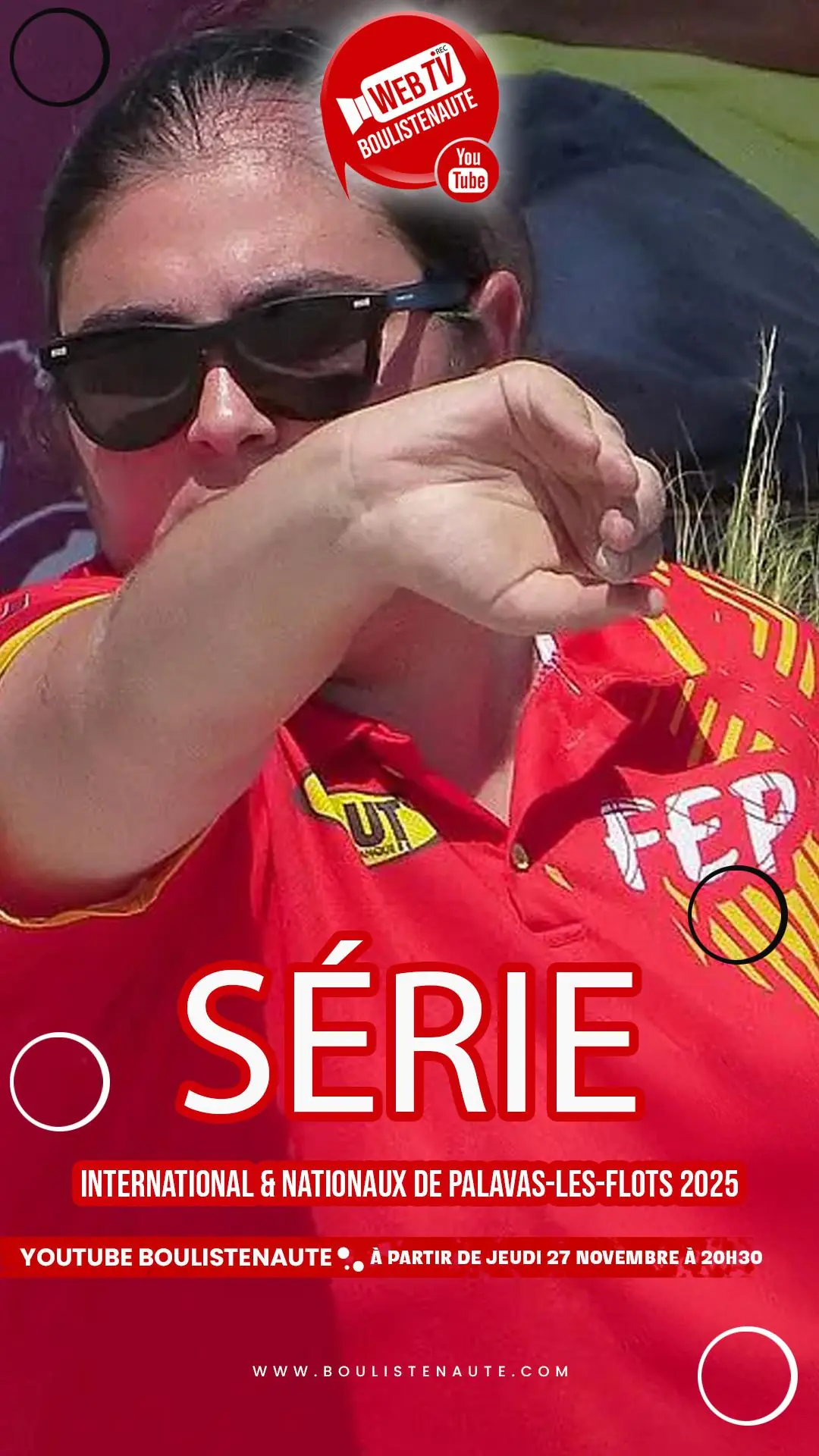 La série de vidéos pétanque : Palavas-les-Flots son International et ses Nationaux féminin 2025 Revivez en rediffusion sur notre chaîne YouTube l'International triplette et les Nationaux doublette et tête-à-tête se sont déroulés du 31 juillet au dimanche 3 août 2025 à Palavas-les-Flots. Pour ne rien manquer de nos vidéos, abonnez-vous et activez les notifications ! Ne manquez pas les 'premières' pour vivre ces nombreuses parties comme en direct et échangez avec d'autres passionnés sur le chat YouTube.